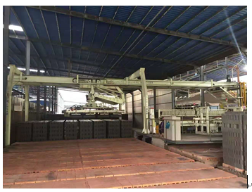 目前两台MPL800机器人最大可以满足断面轨距13.8m移动式隧道窑,日产量在35万至40万标砖。