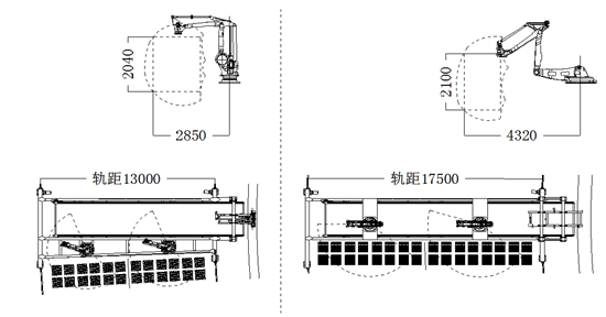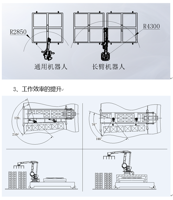 重型长臂码垛机器人有效工作半径在4.3m,最大臂长可达4.6m,而通用机器人仅有2.85m,足足提高了50%。工作半径的增加,使得原来一台机器人只能码一条窑车道,到一台机器人可以同时码两条窑车道。如此可以解决更多的码垛要求,设备工艺布局更加灵活多变。