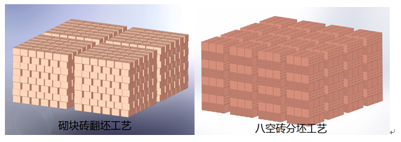 机器人+空中编组机的布置方案,使整体生产线柔性化,无论砌块砖坯的翻坯工艺,还是六孔、八孔砖坯的分坯工艺以及常规的KP1、标砖坯等都可以在此生产线完成,因为机器人抓盘小且灵活,故需要生产不同砖型的时候投资相对较小,能够适应更多的砖型,更换抓盘快捷方便,提高市场竞争力。