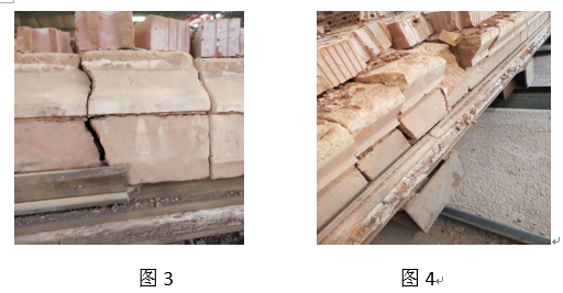 及时维 护和改造。一旦发现框砖有被顶出的现象,就要及时采取措施,不要等到破损严重了再维修或改造,那损失就大了。再就该企业来说,窑车设计和制作中出现问题,由于没有及时改造消减胀力,在使用中框砖不断的被顶歪、顶坏、顶掉,特别是窑车与窑车之间,两边相对的框砖,有的被挤出钢框外面,有的框砖上部挤出变歪,在两车接触时,密封槽还没有碰到,框砖先碰在一起(如图3、图4)。