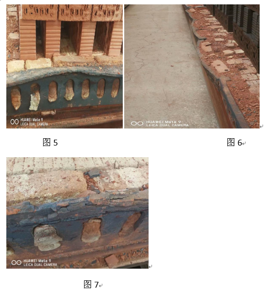 更不可思议的是,该企业窑车框砖出了问题,不找造成损坏的原因,而是把原因都怪到框砖上,说什么耐火框砖不如生铁做的边框(铁围板,下同)结实,事实并非如此。再看另一企业,用铁围板做的窑车,这围板不是也没能把窑车围好吗?(如图5图6)。铁围板反而在没有受到面砖顶的情况下,自己就首先变形严重,说明铁围板的抵抗膨胀能力还不如耐火框砖。如果生铁围板再受到面砖的顶力,变形会更严重。这也反证了生铁围板的弊端。可见框砖或围板抵御胀力的作用是非常有限的,特别是生铁围板受到高温本身就会软化变形,更不要谈什么抵御膨胀力的能力了,关键是在设计制作时要消减膨胀力。 衡量框砖的好坏标准,不能尽看强度这一指标,强度高的围板不是也变形吗?
