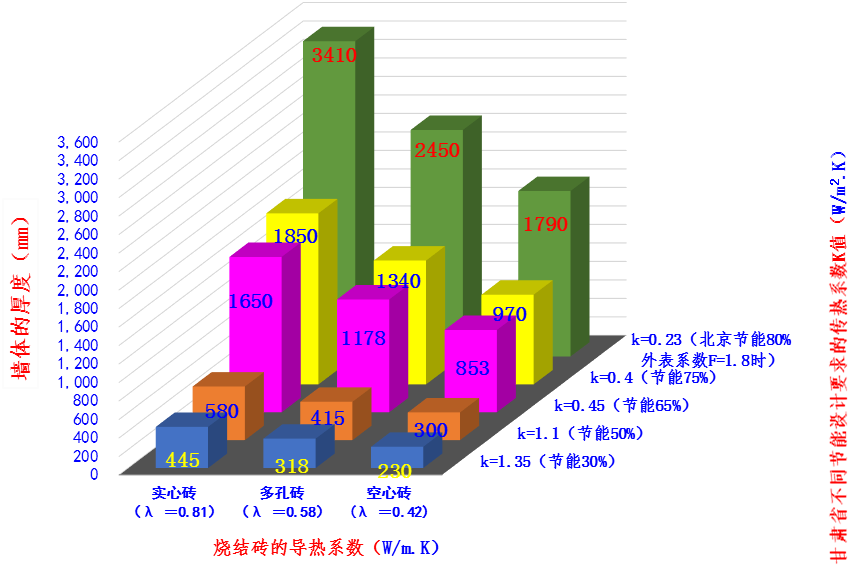 节能设计标准对墙体材料要求的主要指标是墙体传热系数K值。第一、二步节能标准下,烧结多孔砖、空心砖综合性能更好,既能承重、又能达到节能要求、价格低廉、原材料来源广泛、生产技术成熟,烧结砖的综合性能是当时墙材的“全能王”当之无愧,烧结砖得到快速发展和广泛应用。随着2004年北京节能65%的设计标准的实施,对墙体热工性能提出更高要求,烧结砖无论改变孔型结构、增加成孔剂等提高烧结砖的保温性能,都达不到外墙要求的传热系数,“自保温”功能在北方地区已无可能的实际应用,烧结砖仅实现围护、填充功能,保温功能由保温材料完成。(以甘肃省为例,烧结砖单一材料墙体达到外墙传热系数在不同节能标准下需要的墙体厚度见图1。)