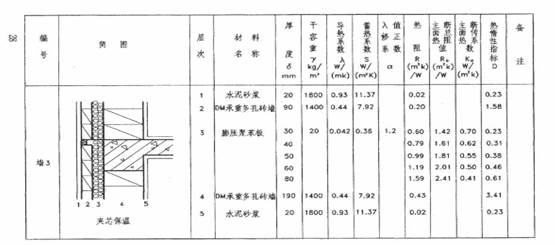 1)、烧结多孔砖kp1(115+240mm)与60mm硬质聚氨酯板复合夹心墙体415mm厚墙体。保温材料防火性能达到复合A级(k=0.38 W/m2.K)