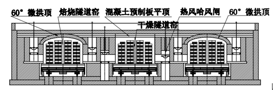 该企业1条干燥隧道窑、2条焙烧隧道窑的“不平衡干燥焙烧”方式,干燥窑和焙烧隧道窑的截面示意见图1。