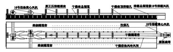 焙烧采用2条焙烧隧道窑,焙烧窑截面宽度为2.8米、窑顶结构为60°微弧拱,拱顶高度为500mm。隧道窑长度约为99米。焙烧窑进车端窑顶,各设置一台16号离心风机,将全部烟气送入一条干燥窑窑内,作为干燥介质。