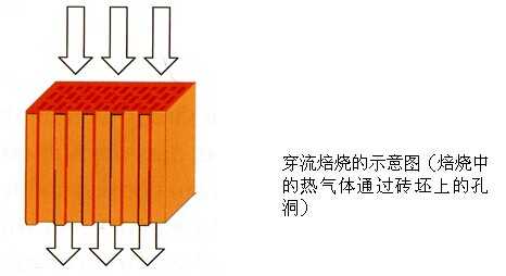 德国艾森砖瓦研究所2005年对承重垂直多孔砖(大块)穿流焙烧的研究结果表明:通常工厂生产中像这样的垂直多孔砖的焙烧时间最快为24小时,而使用穿流焙烧技术仅需5小时或更短的时间。用穿流焙烧技术,烧成后的产品根本没有质量上的负面影响,而且在焙烧特性和产品性能上均有提高。已取得的成果表明,焙烧收缩降低,特别是原材料中含有高的碳酸盐矿物时。穿流焙烧的优点不仅仅是产品容重的降低,由于其焙烧收缩降低较大,而使焙烧裂纹的危险性大大减少。此外,穿流焙烧可使垂直多孔砖产品有着更高的尺寸准确性,从而使座浆面的研磨机械费用减小。穿流焙烧还可使含量高的有机物坯体在200~500℃的温度范围内减少低温碳气的排放,同时在800℃以上也可减少有害气体氟的排放。也就是说,穿流焙烧技术特别有利于高内燃坯体的焙烧。在实际工业生产中应尽最大可能向接近穿流焙烧的方向发展。
