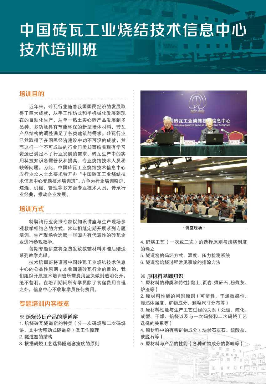 中国砖瓦工业烧结技术信息中心技术培训班第三期将于2013.9.12 -16日开课(9.12报到),特邀行业知名专家曹世璞、湛轩业, 梁嘉琪,黄烈武、。培训内容:烧结砖相关知识与疑难问题解决办法。有疑难问题的企业可将问题汇总,有需要的情况下可拍摄照片带来也可于9月7日前发送至信息中心邮箱xxzx@ompa.com.cn届时专家将在课上统一解答指导。地点:开封市军分区杭州大酒店。标间150元/天(含双早) 届时可自由结合入住。,中餐自理35元/人,晚餐自理,其它费用由中心承担.报名电话:0371-60863533/55/88/99。