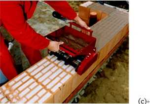 kg/m3),当墙厚为38厘米,通过试验后证实,用这种砌块砌筑的单层墙,甚至达到了不需要供给能量房屋的要求。2007年始到现在这种超低导热系数的砌块已经得到了广泛地应用,并且已经开发出了这种砌块孔洞填充的专门自动化设备,并开始向世界各地推广这种技术。图1所示为这类填充烧结砌块。