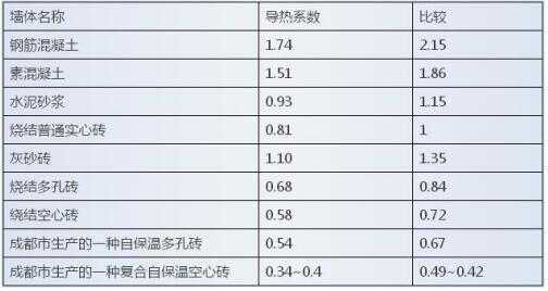 墙体材料的保温性能以其导热系数来表示,单位是W/m·k,导热系数越大,其传热能力也越大,保温性能也越差。几种常用墙体材料的导热系数见表1。
